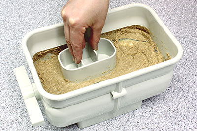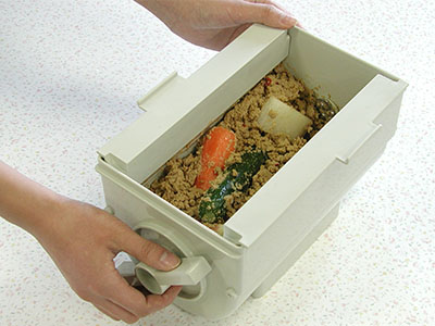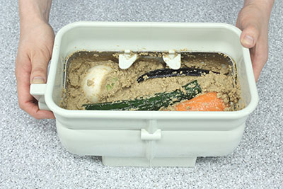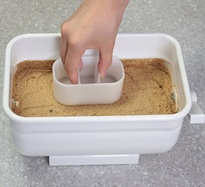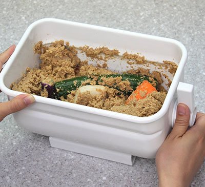 付属の押し器で回りについたぬかを掃除しつつ、ぬか床を押し付け漬け込みます。水抜きは、押し器をぬか床に埋めておき水が溜まったら捨てます。