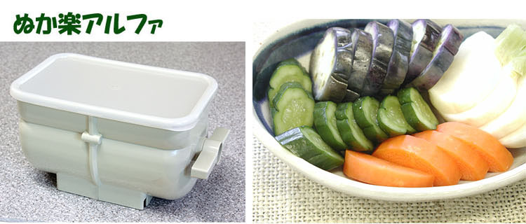 「ぬか楽アルファ」は、かき混ぜ、漬け込み、水抜きなどのぬか漬け作りに必要な毎日の作業が、ぬか床に手を入れずに手軽にできる、ハンドルかき混ぜ式のぬか漬け容器です。