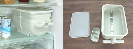 ぬかの水分が増えると、中フタの上に水が浮くので中フタを押さえたまま、本体を傾けて流しに水分だけを捨てられます。