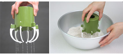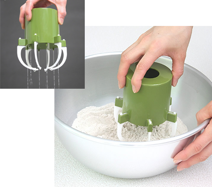水回し・まとめ - 付属の水回し器に水を入れ、ボールに入れたそば粉の上でかき回すだけで、ノズルから細かに滴下する水と粉とを、6本の爪がまんべんなく効率よく混ぜ合わせます。