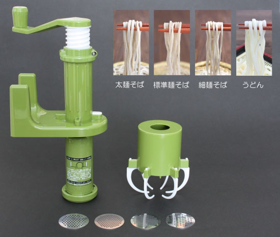「そば楽」に付属の標準そば用ダイスの他に、太麺・細麺そば用ダイスと、コシのあるうどん麺が作れるダイスが加わり、益々楽しく充実した「そば楽プラス」。