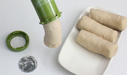 こね棒でこねる - シリンダーに円板を取り付け、円柱状にまとめた生地を入れて本体に固定します。